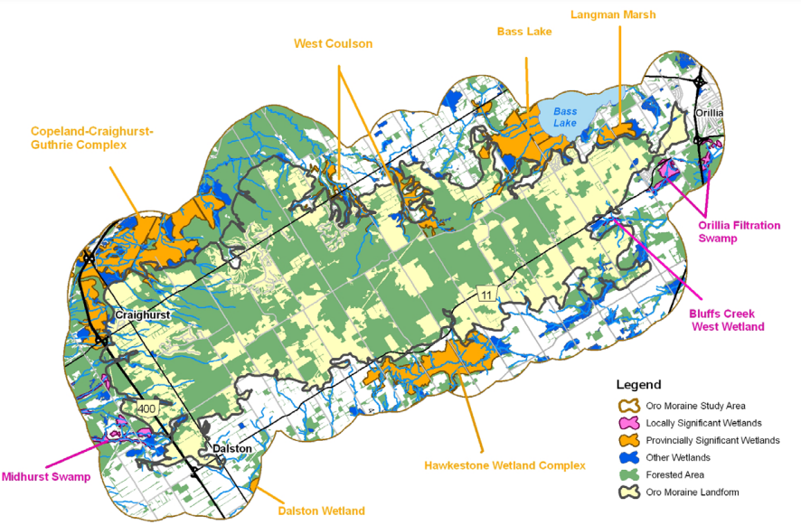 According to a study from the University of Waterloo; the development of and extraction of gravel from the Oro Moraine may cause serious damage to the present aquifers, disrupting the water flow/recharge/storage process within the moraine. This will cause further degradation to the wetlands that rely on the water flow from the moraine, such as the Copeland Forest/Wetland, Bass Lake, Hawkestone Wetland Complex, Minesing Wetland and many more.